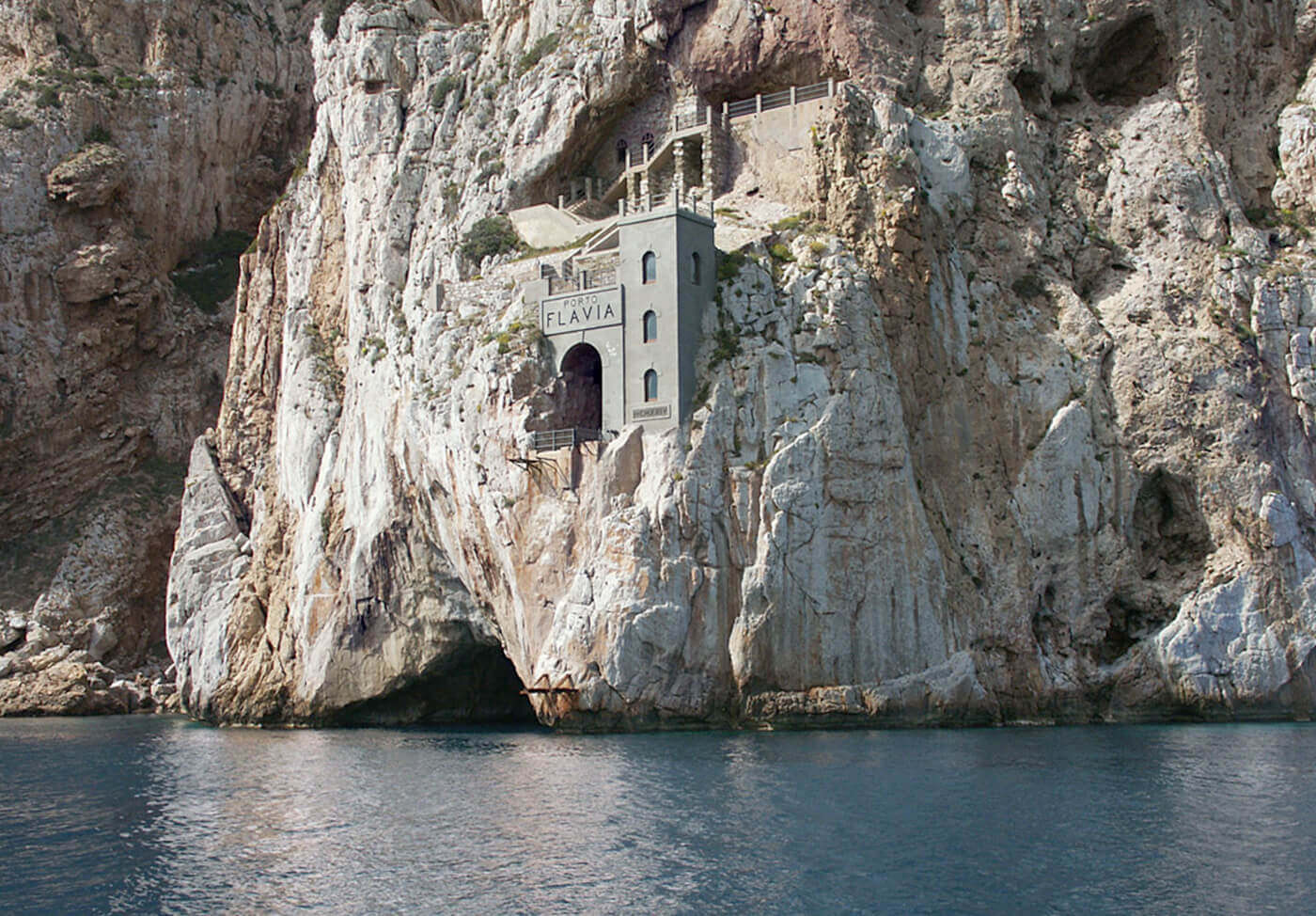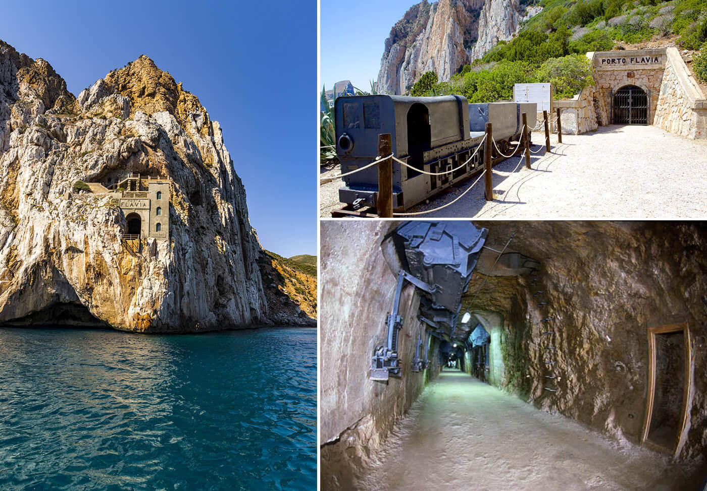 Porto Flavia in Sardinia is a port dug into cliffs at 50 metres above sea level. Consisting of two 600 metre tunnels, and an ingenious mechanical arm, Porto Flavia was used to load zinc, lead, and other mined ore, directly from the mining operations within the cliffs, onto cargo ships waiting in the waters below.