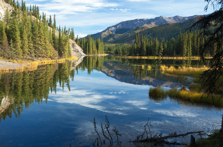 Reflections in the beautiful, blue, still waters of Horseshoe Lake, at Denali National Park in Alaska.