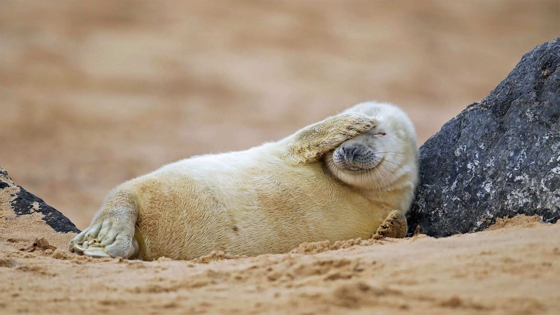 Grey seal pups resting on the sandy shores of Norfolk, in England. About 3,000 grey seal babies are born annually on Norfolk's shoreline between early November and January. (Click on image to view full size.)