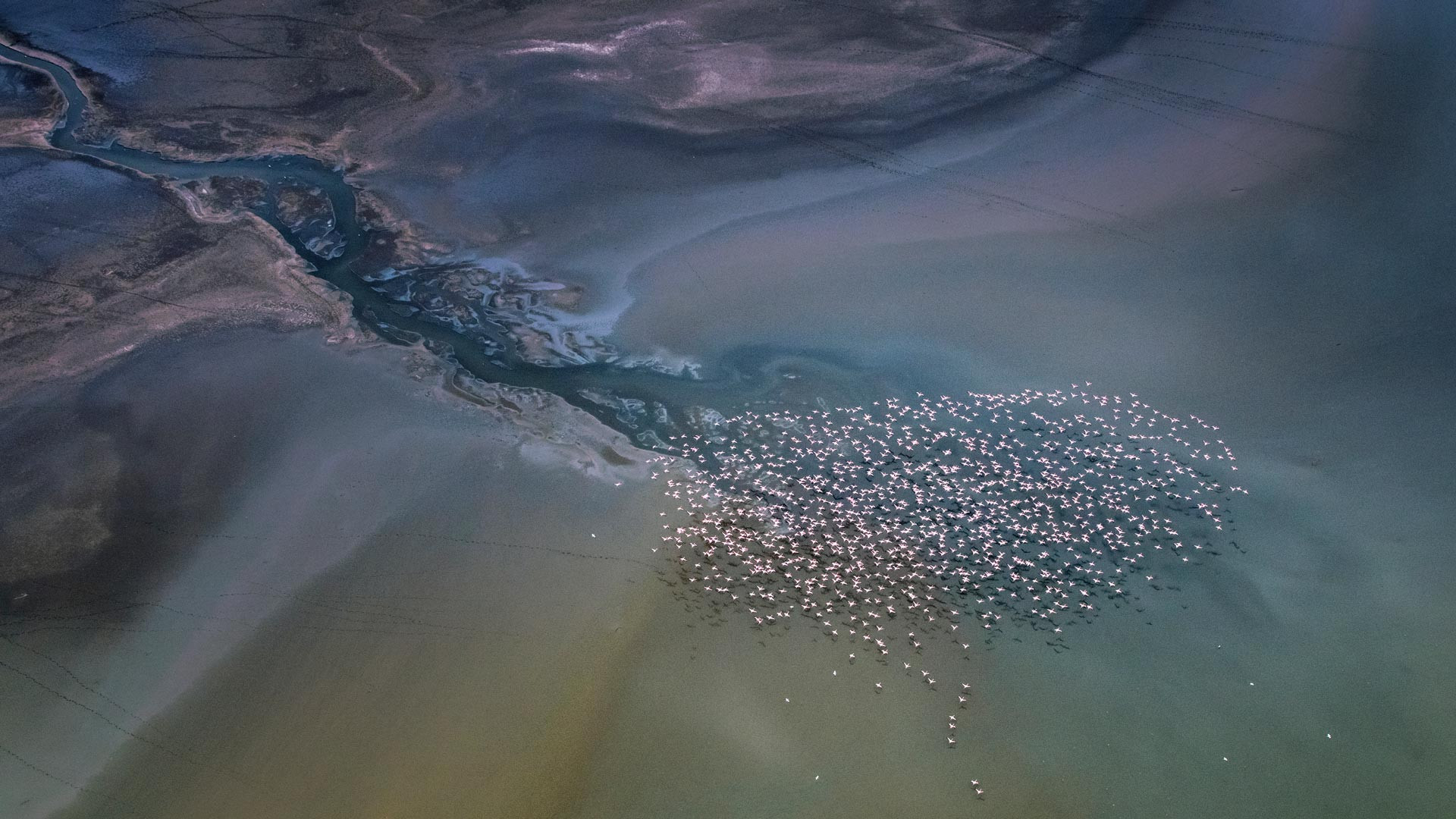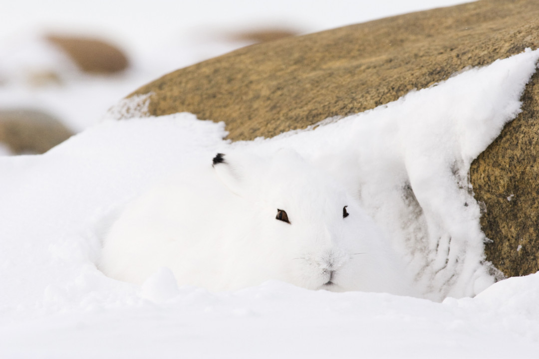 Arctic hares hidden in the snow, thanks to their camouflage. (Click on image to view full size.)